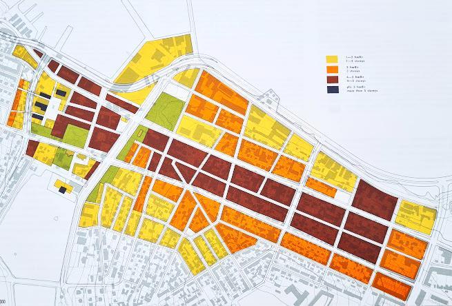 Miðbænum og Austurbænum. Gulur: 1-2 hæðir. Appelsínugulur: 3