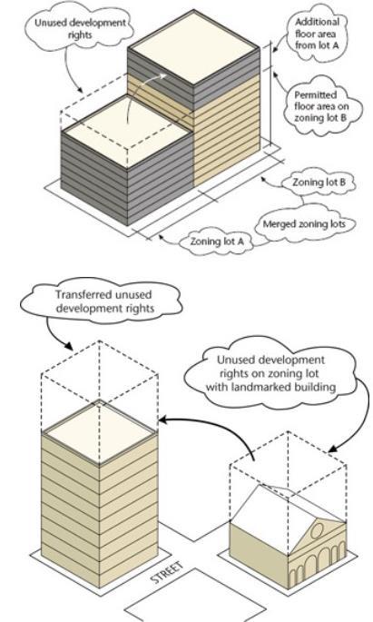 Mynd 33: Tvær helstu tegundir af flutningi á gólfflatar-hlutfalli sem leyfð er úr skýringum á svæðis-skipulagsreglum NYC (NYC
