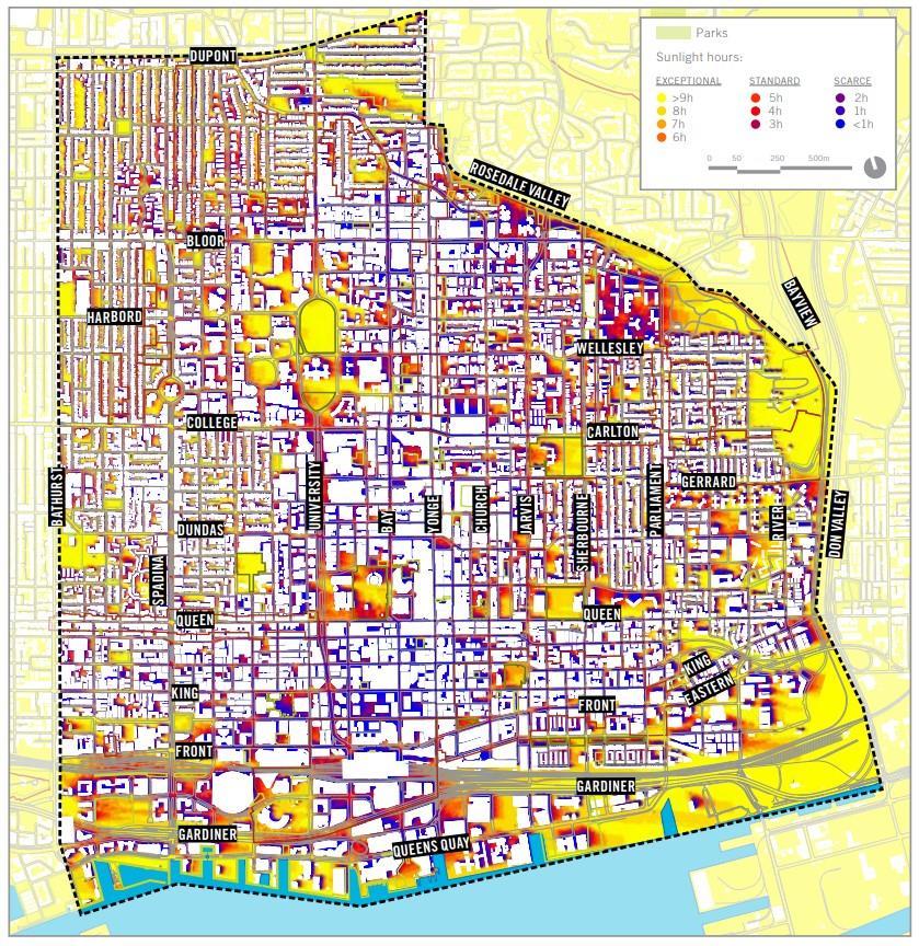 Mynd 39: Greining á uppsöfnuðum klukkustundum sólar og skuggavarps í Toronto borg 21.september (TOcore, e.d., bls. 55).. 38