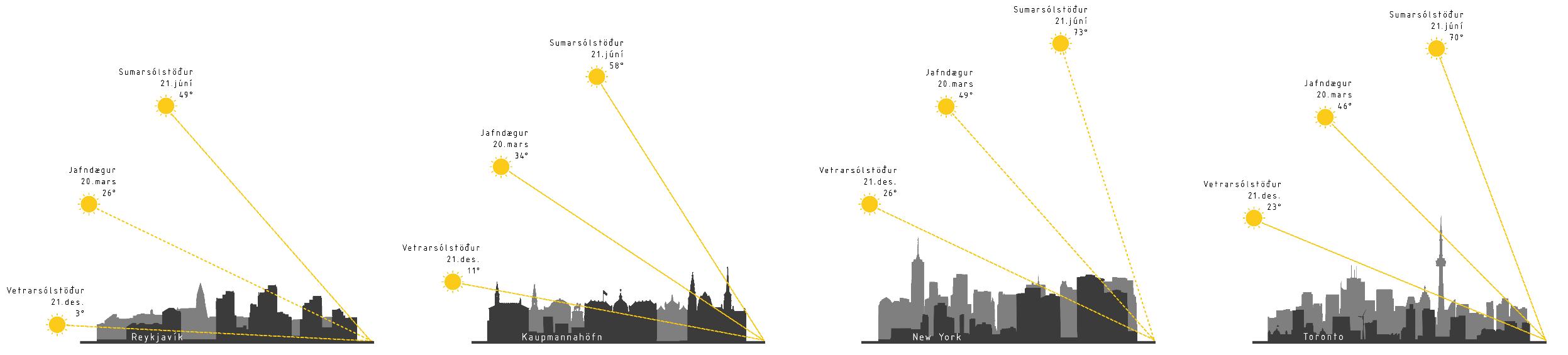 Mynd 24: Afstöðumynd með samanburði á hæð sólar í Reykjavík við aðrar borgir, Kaupmannahöfn, New York og Toronto á vetrarsólstöðum, jafndægri og sumarsólstöðum.............................. 23
