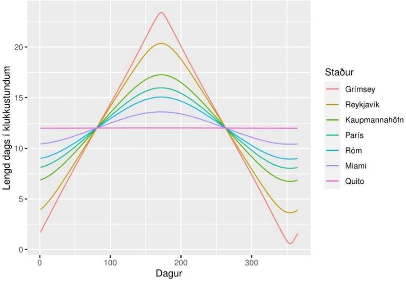 Mynd 21: Samanburður á lengd dags yfir árið, munurinn vex þegar nær dregur heimskautabaugunum (Halldór Björnsson, 2022)......... 21