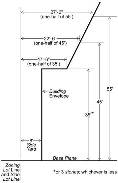 Mynd 32: Til vinstri: Kröfur um inndregni/stöllun fyrir háar byggingar. Til hægri: Kröfur um inndregni fyrir háar byggingar í lág þenslu hverfum úr Svæðisskipulagi NY (Up codes, e.d.)................33