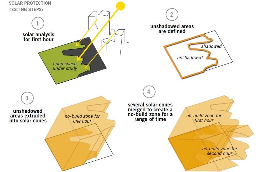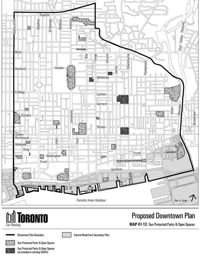 Mynd 38: Úr Miðbæjarskipulagi Toronto. Garðar og opin svæði þar sem vernda á sólarljós (Tocore, e.d., bls. 84)..................................