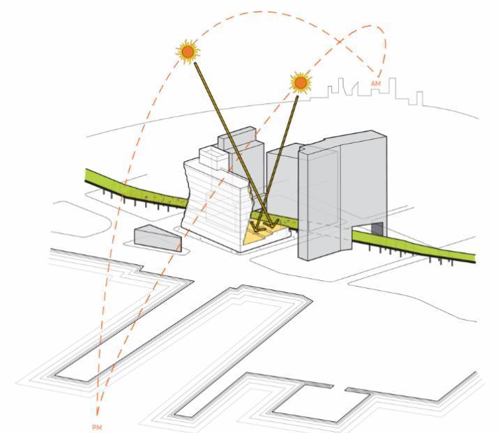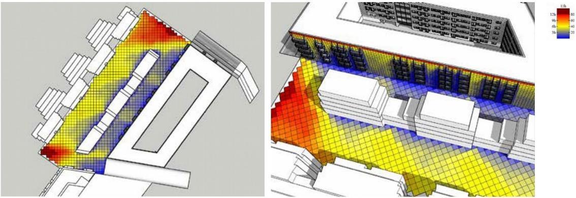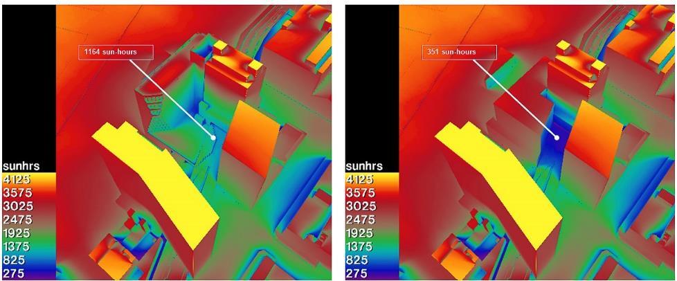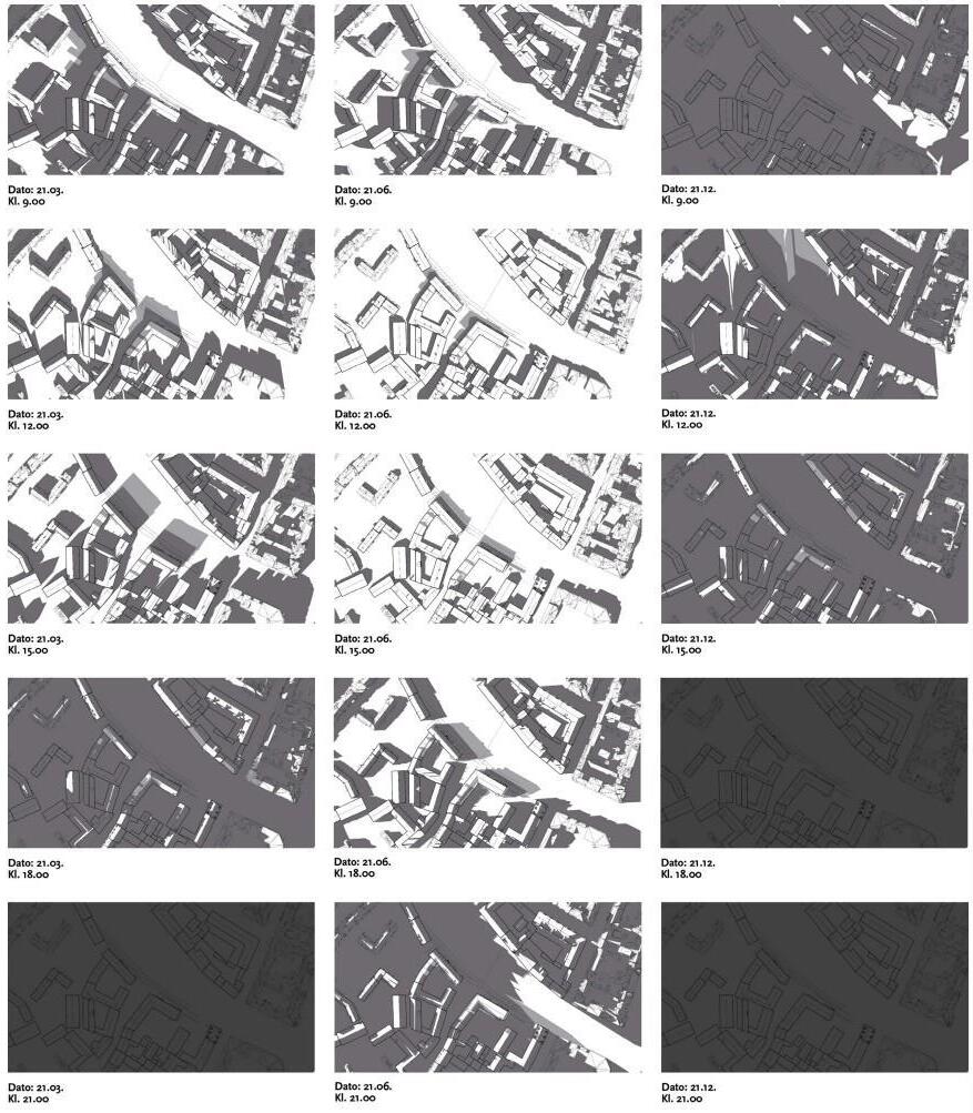 Samanlagt skuggavarp sýnir að á hádegi á jafndægri nær skuggi yfir meira en helming rýmisins. Um há sumar nær sólarljós vel niður í rýmið og einnig að nokkru leyti niður á gangstéttina sem snýr undan sól.