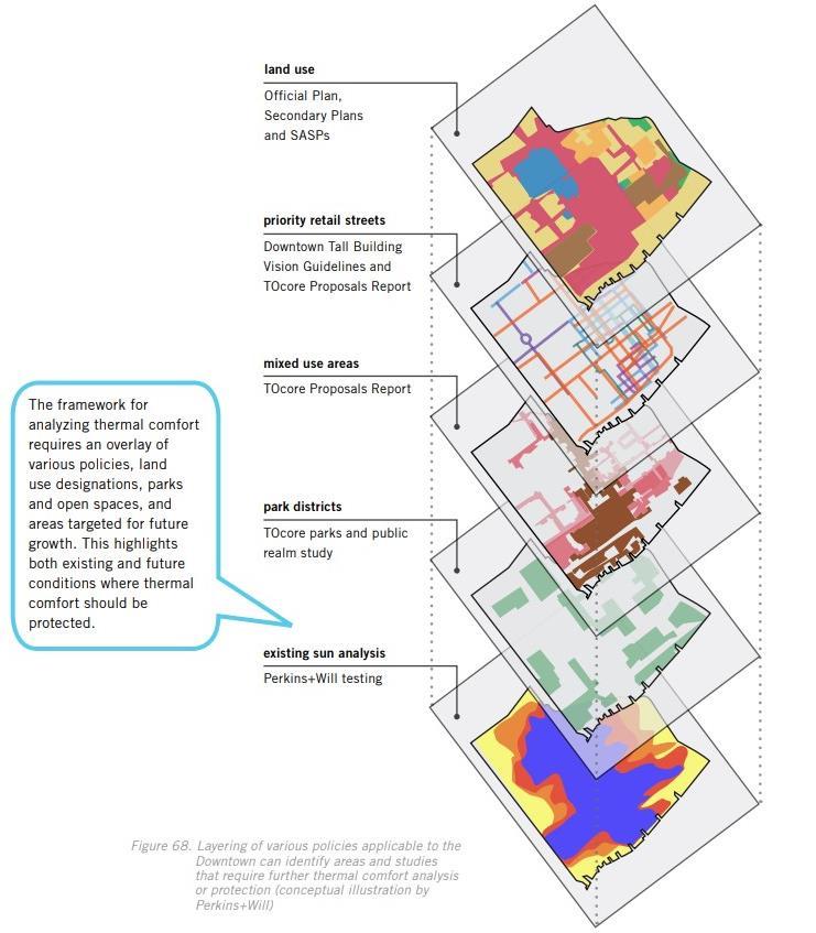 Mynd 40: Lagskipting ýmissa reglna sem gilda um miðbæinn geta auðkennt svæði sem krefjast frekari greiningar á varmaþægindum eða vernd. Ramminn til að greina hitaþægindi krefst skoðunar á ýmsum stefnum, landnotkunarmerkingum, almenningsgörðum og opnum rýmum og svæðum sem miða að framtíðarvexti. Þetta undirstrikar