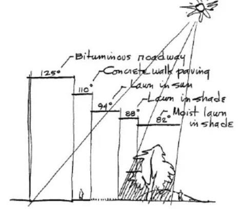 Mynd 3: Yfirborðshiti: Á heitum sumardegi getur hitastigið verið mjög mismunandi á hverjum stað fyrir sig (Starke og Simonds, 2013).
