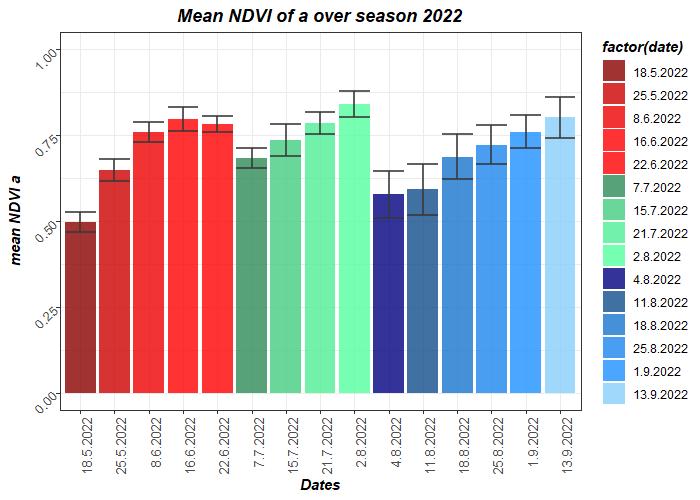 Figure 10: Mean NDVI and standard deviation of treatment f1 (cow manure + Viscolight) over the growing season in 2022. The color changes between red, green, and blue indicate the time periods between mowing dates. 13