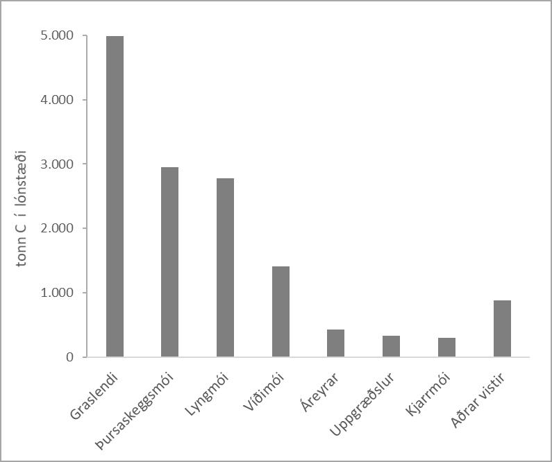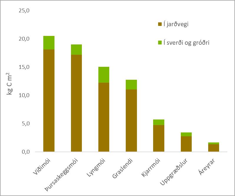 Magn lífræns kolefnis í jarðvegi þeirra sjö yfirborðsþekjuflokka sem kannaðir voru (mynd 3) reyndist á bilinu 1,4 kg C m2 (áreyrar) til 18,1 kg C m2 (víðimói). Í gróðri og sverði var magnið á bilinu 0,3 kg C m2 (áreyrar) til 2,8 kg C m2 (lyngmói). Samanlagt magn kolefnis á fermetra lands reyndist því hæst í víðimóa (20,5 kg C m2) en lægst (1,7 kg C m2) í áreyrum (mynd 3).
