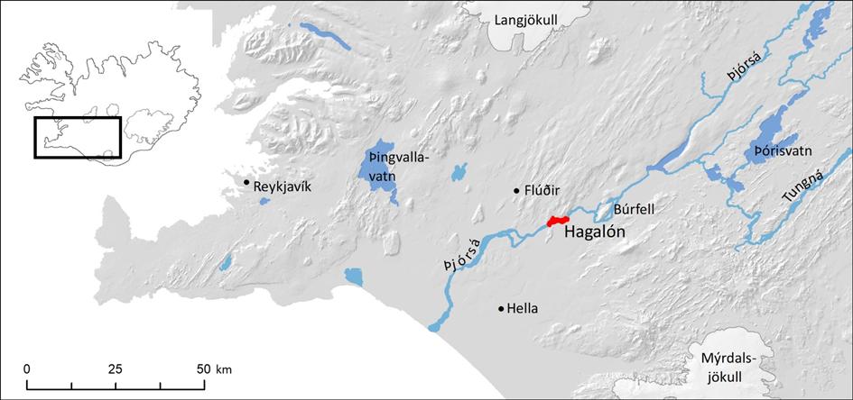 Hagalón er uppistöðulón áætlaðrar Hvammsvirkjunar í Skeiða og Gnúpverjahreppi, en virkjunin mun nýta fall Þjórsár neðan Búrfellsvirkjunar, frá svokölluðu Yrjaskeri rétt ofan við bæinn Haga og niður fyrir Ölmóðsey austan við Þjórsárholt (Landsvirkjun, 2020; mynd 1). Lónsstæðið er um fjórir ferkílómetrar að stærð og eru tveir þriðju hlutar þess árfarvegur Þjórsár, en einn þriðji hluti áreyrar og gróið land, einkum mólendi og graslendi (mynd 2). Gróin svæði er annars vegar að finna við mörk lónsstæðisins að norðan og sunnanverðu og hins vegar í Hagey sem er all stór eyja í miðri Þjórsá, en eyjan mun að stórum hluta fara á kaf við myndun lónsins.