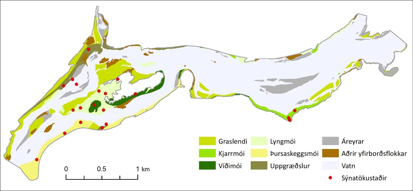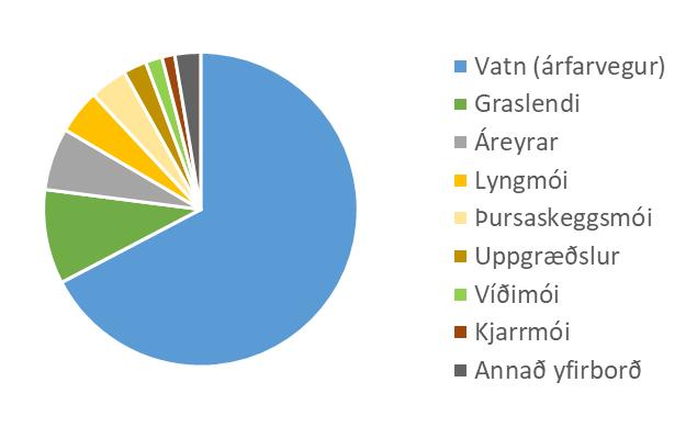 Yfirborðsþekjuflokkar ha % Heiti notuð í skýrslunni Vatn 270,7 67,3 Vatn (árfarvegur) Graslendisvist 39,1 9,7 Graslendi Eyravist 25,8 6,4 Áreyrar Holtamóavist 18,5 4,6 Lyngmói Þursamóagraslendisvist 15,5 3,9 Þursaskeggsmói Uppgræðslur 9,7 2,4 Uppgræðslur Móavist og giljamóavist 6,9 1,7 Víðimói Graslendisrunnavist 5,3 1,3 Kjarrmói Óvist 2,0 0,5 Sandavist 1,8 0,4 Birkiskógavist 1,6 0,4 Blómlendisvist 1,1 0,3 Garðlönd-tún 1,0 0,3 Námur 0,8 0,2 Moldir 0,6 0,2 Grjótvist 0,4 0,1 Melavistir 0,4 0,1 Móavist og giljamóavist 0,4 0,1 Lynggambravist 0,2 0,1 Rekjuvist 0,2 0,1 Melgresisvist 0,1 0,0