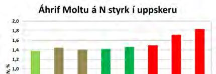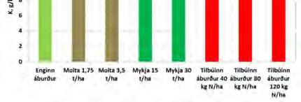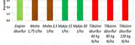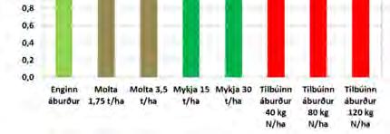 Áburðarnotkun gaf meira þurrefni í uppskeru í samanburði við uppskeru úr pottum sem engan áburð fengu. Uppskeruaukning var meiri með áburði með háu N innihaldi. Mesta þurrefnið í uppskeru fékkst með Pioner complete 6-1-3® og fiskimjöli. Molta úr búfjáráburði var sambærileg við sveppamassa, en plöntumolta náði einungis örlítið meiri uppskeru en viðmið.