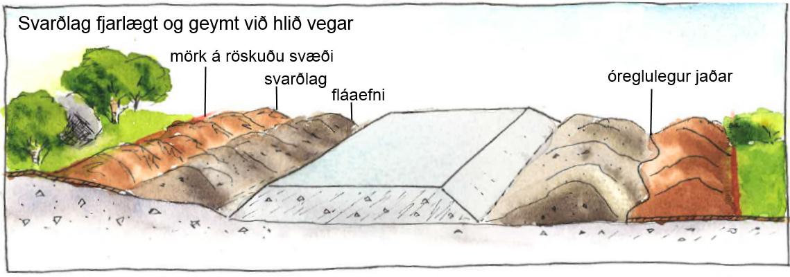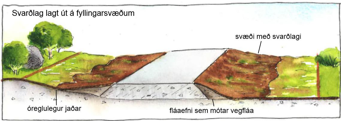 Svarðlagiðeraðgreintfráundirliggjandijarðvegi dreiftstraxeðahaugsett.Viðfrágangersvarðlagi dreiftáyfirborðiðofanáneðrijarðvegslög.Svarðlagiðinniheldurfrjósamastahlutajarðvegsinsog geturflýttlandnámistaðargróðurs