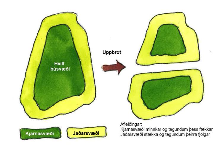 Vegirskiptaþvílandisemþeirliggjaumuppíminnieiningarogbrjótaþanniguppbúsvæði dýra-ogplöntustofna.95 Uppbrotbúsvæðageturbreyttdreifinguogflæðitegundamilli svæðaogþannighaftáhrifátegundaauðgiogtegundasamsetningu.29 Almenntgildiraðþví minniogdreifðarisembúsvæðieruþvífærritegundumgetaþauhaldiðuppiogþvíer uppbrotbúsvæðatalineinafhelstuógnunumviðlíffræðilegafjölbreytniídag.105 Við vegagerðtapastheldurekkiaðeinsþaðlandsemferundirvegamannvirkinsjálfheldurgetur húnleitttillægrahlutfallskjarnasvæðamiðaðviðjaðrabúsvæða(mynd3),semhefuráhrif álíffræðilegafjölbreytniþarsemfleiriframandiogfærriinnlendartegundirerulíklegartil aðfinnastájaðarsvæðunum.35