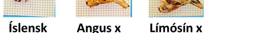 Ámynd14séstbeturhvaríslenskufölliníeldistilraunLbhÍáMöðruvöllum2014–2016lendaáEUROP skalanum.Myndinsýniraðíslenskunautinerunálægtmiðjumskalaífituenvelundirmiðjumskalaí holdum.Ííslenskakerfinuhinsvegar,eruþessiföllítveimurefstuholdaflokkunum(UNúrvaleðaUN 1)ogíraunerþarekkigertráðfyriraðtilséuholdagripirhérálandi.Ámynd15ersamanburðurá EUROPflokkunalíslenskranautgripaviðAngusogLimósíneinblendinga(nautogkvígur).Þarkemur framgríðarlegurmunuráholdaflokkumenminnimunuráfituflokkunþóaðíslenskunautinséulíka þarmeðlægstuflokkunina(ÞóroddurSveinssonogLaufeyBjarnadóttir,2000).