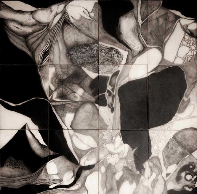 Sedimentos, 2020 Grafite, nanquim e tinta acrílica com encáustica de cerasobre suporte de madeira. 48 x 48 cm