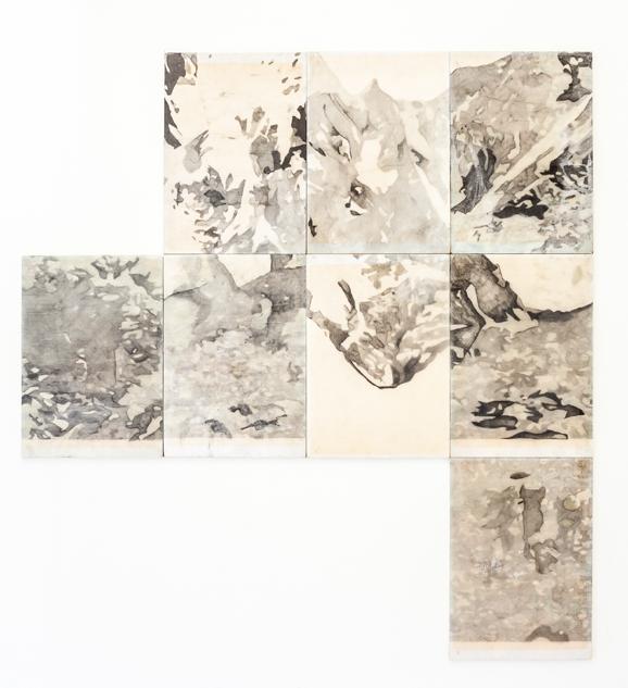 Sedimentos / Fragmentos, 2019 Lápis e nanquim s/ papel com veladura de cera. 54,5 x 91 cm