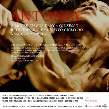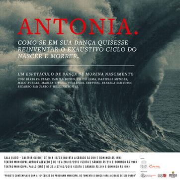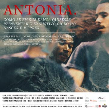 ProjetoPauloAzevedoTeatroGaleria“ANTONIA”ESPETÁCULOTEMPORADAOlido,MunicipalArthureTeatroMunicipalEiró.gráfico Desenvolvimento de Identidade Visual para o espetáculo e peças gráficas para divulgação. Direção: Morena Nascimento São Paulo, 2016