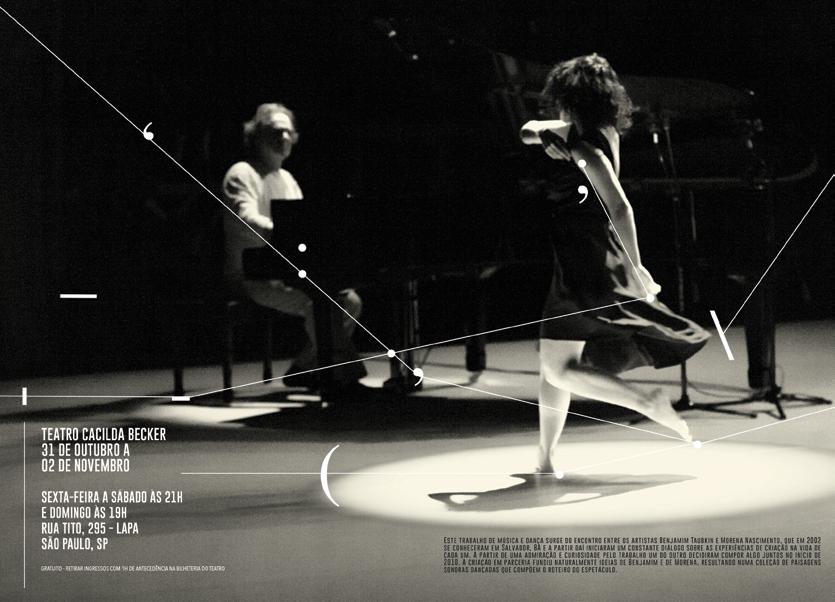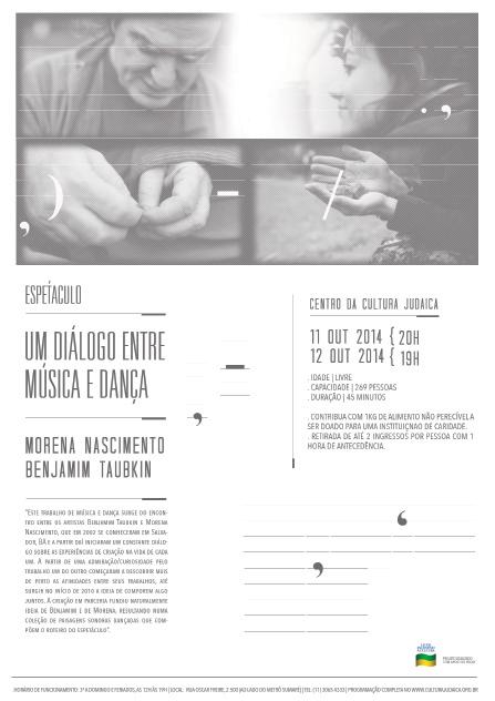 ProjetoSãoCentroSãoTeatroEENTRE“UMESPETÁCULODIÁLOGOMÚSICADANÇA”JoãoCaetano,PauloSP,2015.daCulturaJudaica,Paulo,2014.Gráfico Desenvolvimento e implementação da identidade visual do espetáculo. Programa do espetáculo, cartazes, banners, adaptação para as redes Projetosociais.contemplado pela 16ª edições do Fomento a Dança de São Paulo SP. Direção e criação: Morena Nascimento e Benjamin Taubkin.