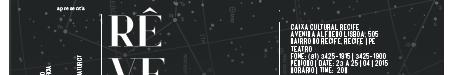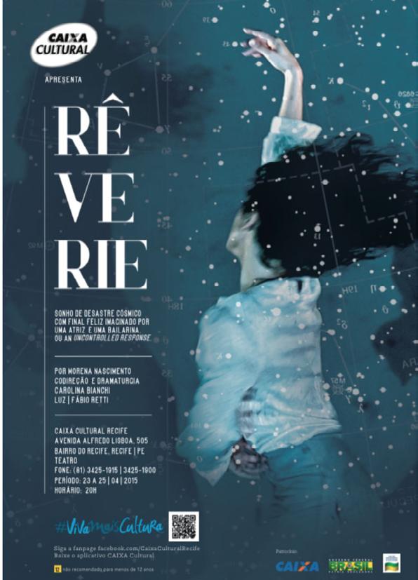 Espetáculo “Rêverie” Temporada 2014 e 2015 Sesc Santo Amaro, São Paulo SP. Sesc São Carlos, SP. Caixa Cultural, Brasília DF. Clemront-Ferrand, França FR. Galeria Olido, São Paulo SP. Caixa Cultural, Recife PE. Projeto gráfico Elaboração de Identidade Visual para o espetáculo e produção gráfica. Direção: Morena Nascimento.