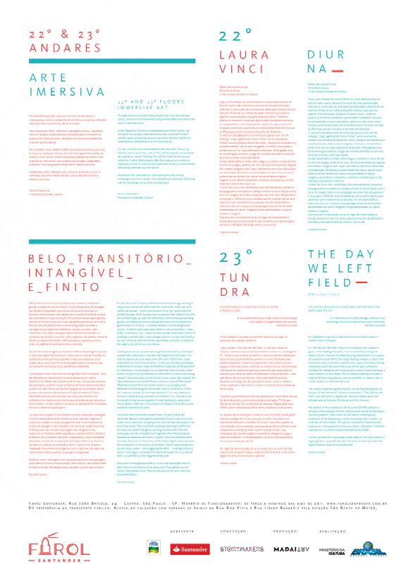 Capa do Catálogo da 1 a edição do projeto de Arte Imersiva do Farol TítuloSantander.daExposição: “Belo, IntangívelTransitório,eFinito” Direção Artística: Facundo Guerra Artistas convidados: Coletivo Tundra (Rússia) Laura Vinci (Brasil)
