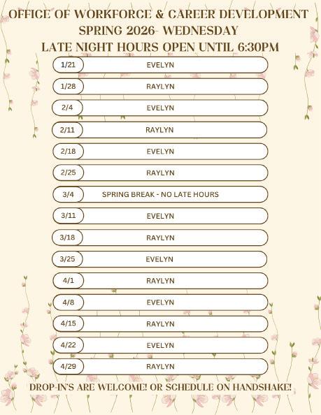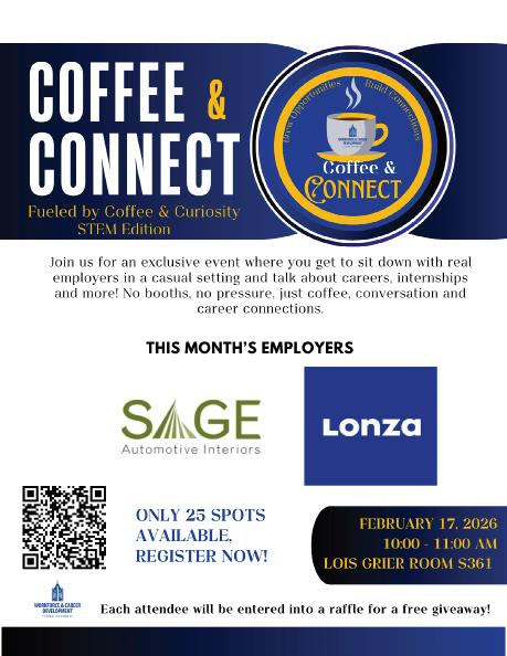 30 student slots will be available. Students should sign up with Workforce and Career Development Staff (perhaps via Handshake).