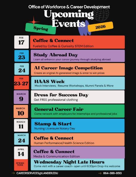 “The College of Humanities, Arts, and Social Sciences aims to provide excellent teaching and mentorship of students to prepare them for life after Lander,” Dean Lucas McMillan said. “This first annual HASS Week is meant to showcase many careers that are possible through the college’s academic programs.” Events throughout the week will focus on internships, alumni