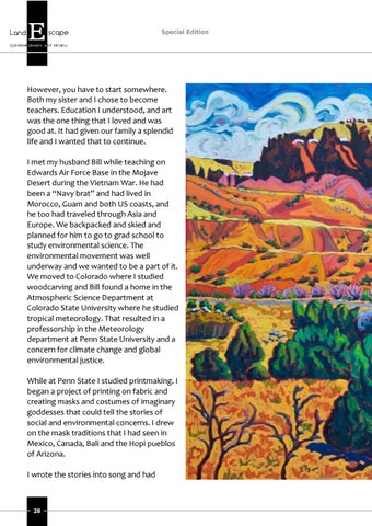 However, you have to start somewhere. Both my sister and I chose to become teachers. Education I understood, and art was the one thing that I loved and was good at. It had given our family a splendid life and I wanted that to continue. I met my husband Bill while teaching on Edwards Air Force Base in the Mojave Desert during the Vietnam War. He had been a “Navy brat� and had lived in Morocco, Guam and both US coasts, and he too had traveled through Asia and Europe. We backpacked and skied and planned for him to go to grad school to study environmental science. The environmental movement was well underway and we wanted to be a part of it. We moved to Colorado where I studied woodcarving and Bill found a home in the Atmospheric Science Department at Colorado State University where he studied tropical meteorology. That resulted in a professorship in the Meteorology department at Penn State University and a concern for climate change and global environmental justice. While at Penn State I studied printmaking. I began a project of printing on fabric and creating masks and costumes of imaginary goddesses that could tell the stories of social and environmental concerns. I drew on the mask traditions that I had seen in Mexico, Canada, Bali and the Hopi pueblos of Arizona. I wrote the stories into song and had