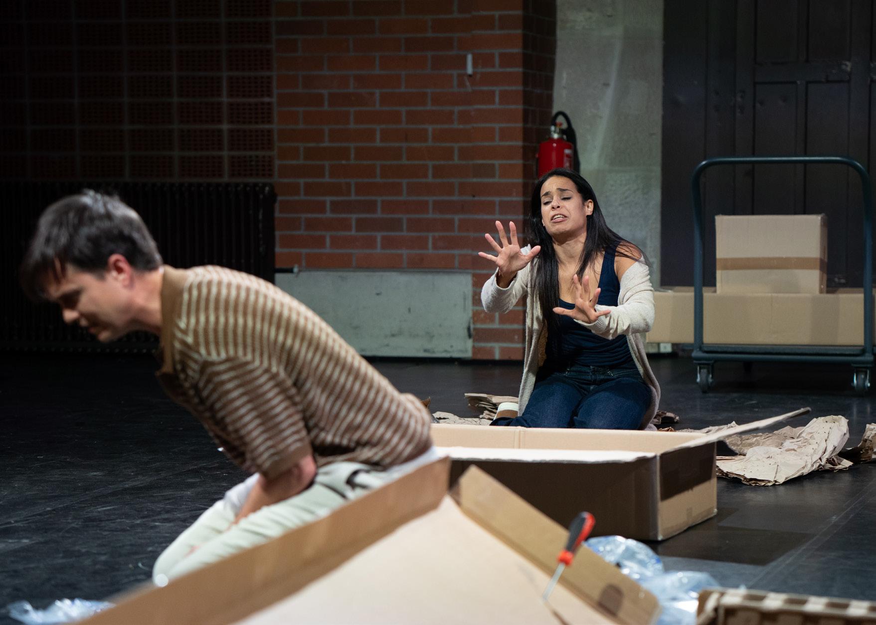 In Atmen beginnt ein namenloses Paar in der Schlange an einer IkeaKasse ein Gespräch über die Zukunft, in der sie eventuell ein Kind in die Welt setzen könnten. Doch die Welt, in die dieses theoretische Kind geboren werden würde, steckt voller realer Krisen: Überbevölkerung, Klimawandel, schrumpfende Ressourcen, wirtschaftliche Unsicherheit. Wäre es verantwortungslos, jetzt ein Kind zu bekommen oder wäre es das einzig Richtige, um die unsichere Zukunft irgendwie mitzugestalten? Das Paar gerät in einen Strudel aus Nähe und Distanz und nimmt das Publikum mit auf eine Achterbahnfahrt durch ihr ganzes, für unsere westliche Gesellschaft so exemplarisch, bis ins Detail durchdiskutiertes Leben. Ein kollektives Überlebenstraining, das nichts verharmlost, nichts verschweigt, aber trotz aller Katastrophen Mittel an die Hand gibt, um auch am nächsten Tag weiter zu atmen. Am besten im Kollektiv.