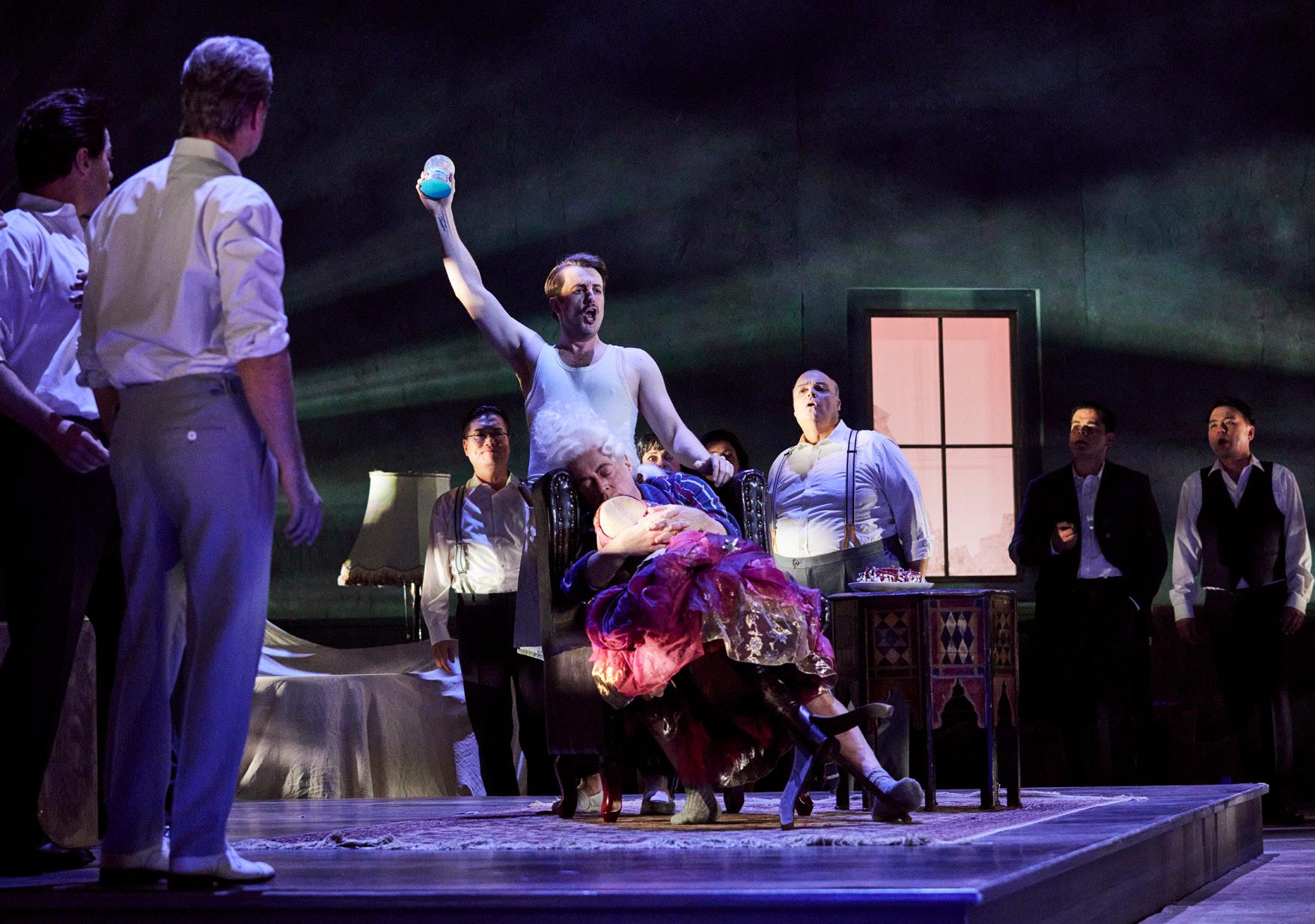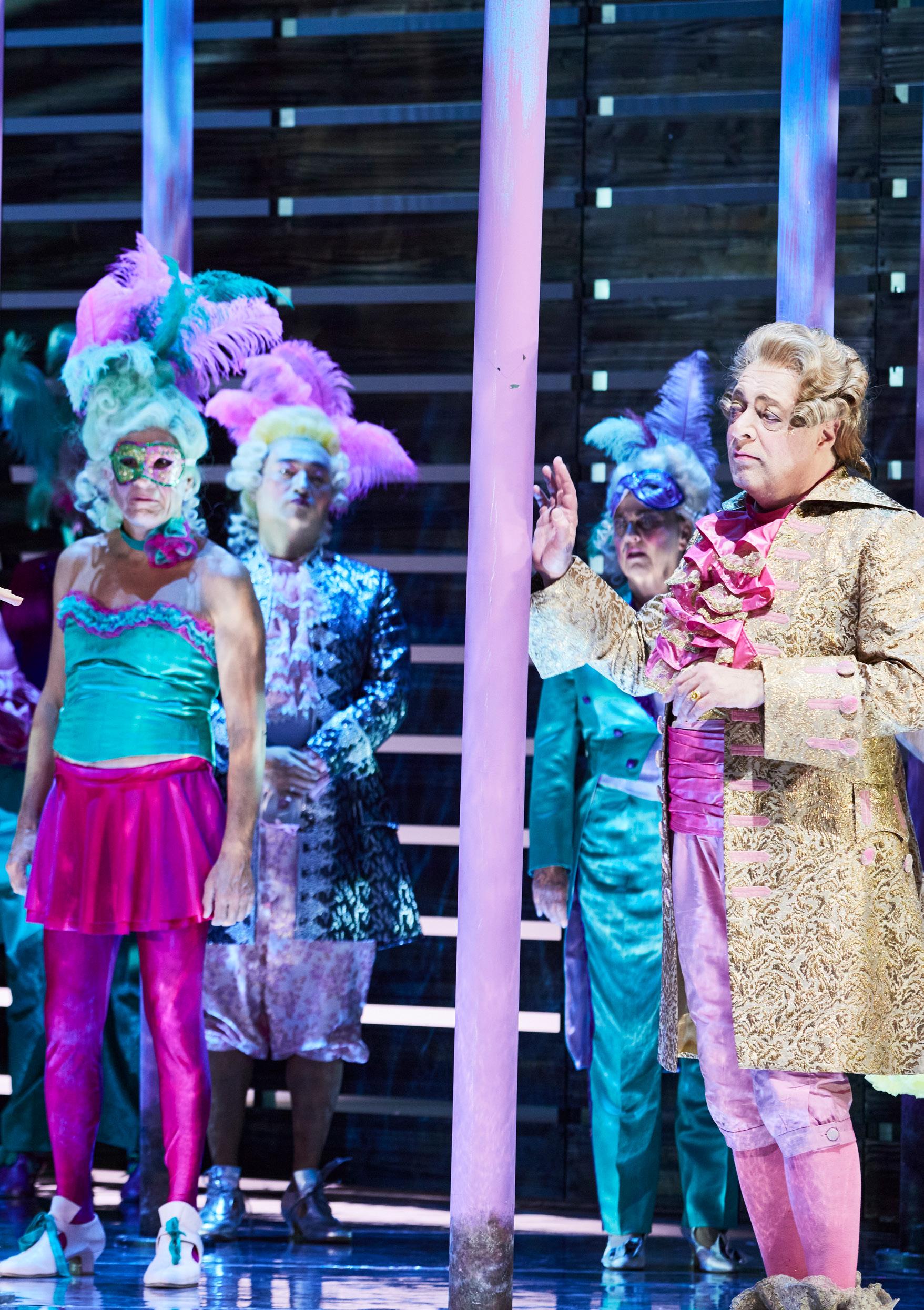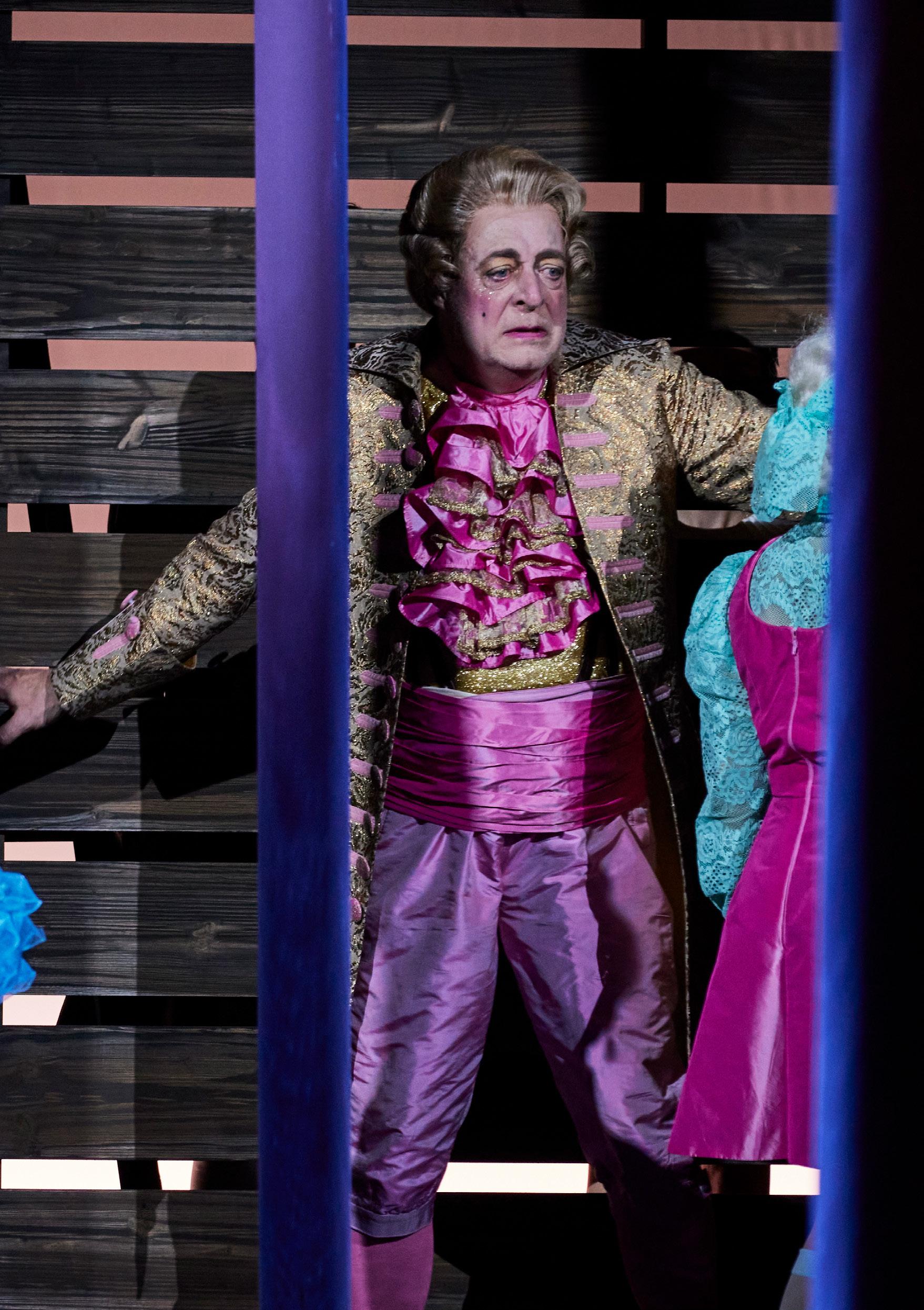 Die Figuren der Oper erscheinen als groteske Masken. Besonders der Herzog von Urbino, Strauß’ Verkörperung des Casanova, tritt als narzisstische Wunschprojektion des Schauspielers auf. Damit überlagern sich auf der Ebene der Inszenierung zwei Repräsentationsschichten: die narrative Struktur der komischen Oper und die psychologische Tiefenstruktur einer Erinnerungslandschaft.