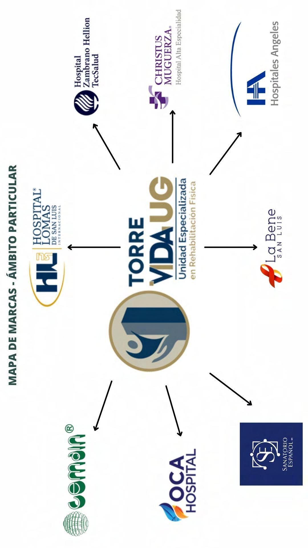 Los logotipos principalmente que se encuentran en el mapa de marcas de ámbito particular, cotejando con el de Torre Vida, puedo darme cuenta que comparten una relación en los colores, el uso cromático que le dan es totalmente colores fríos, donde no se salen de la gama de los azules, pero todos usan un contraste con un color cálido para resaltar alguna zona, símbolo o en la tipografía, al igual que torre vida, colores contrastantes muy relacionados y parecidos con el ámbito de la medicina, con una estética de seriedad, usan colores como azul marino, negro, blanco y morado principalmente.