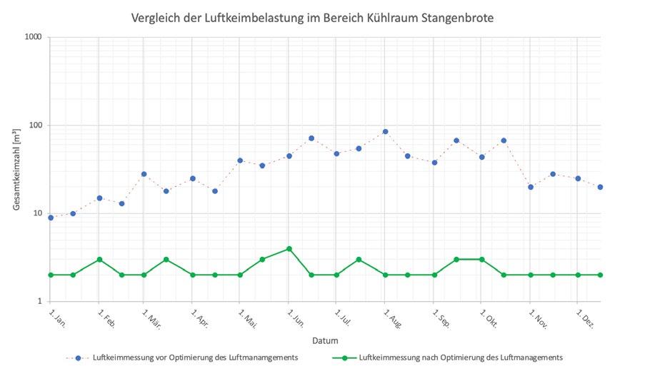 Verlauf des Vergleichs der Luftkeimwerte im Kühlraum der Stangenbrote über einen längeren Zeitraum