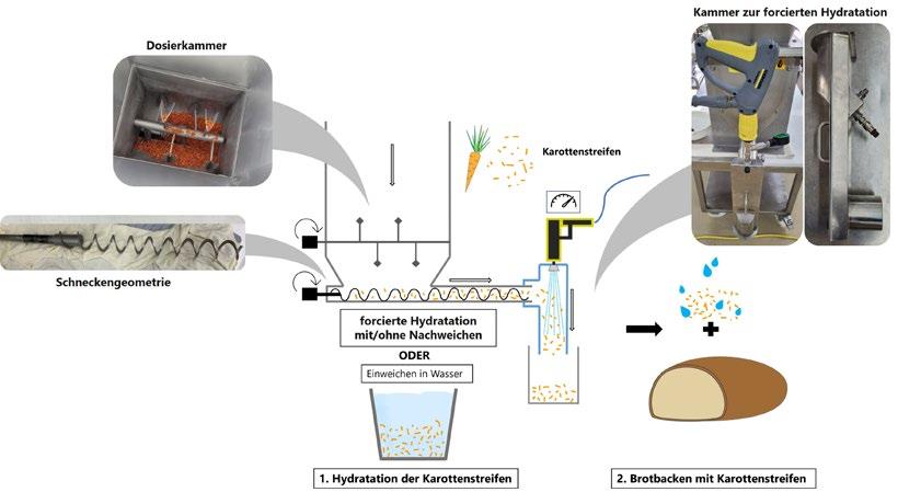 Für die forcierte Hydratation wurde ein Dosiergerät mit Trichter und Frequenzumrichter zur Einstellung der Dosiergeschwindigkeit, zusammen mit einer Rapidojet-Mischkammer mit stationärer Düse eingesetzt. Die schematische Darstellung des experimentellen Versuchsaufbaus sowie der eingesetzten Geräte zeigt die Abbildung 1. Als Spezialzutaten wurden getrocknete Karottenstreifen zweier Qualitäten verwendet, die allerdings auf dem Markt unter vergleichbaren Produktspezifikationen erhältlich waren. Die getrockneten Karottenstreifen (200 g) wurden jeweils bei drei unterschiedlichen Druckeinstellungen (100, 125 und 150 bar) und drei Förderfrequenzen (6, 15 und 30 Hz) hydratisiert.