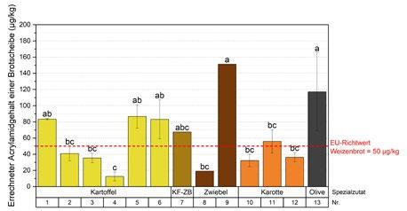Notwendigkeit des Forschungsprojekts. Dabei muss deutlich erwähnt und berücksichtigt werden, dass die Produkte „auf Verdacht“ ausgewählt wurden, und somit keinesfalls einen Durchschnitt der Backwaren in Deutschland darstellen, sondern nur einen Auszug von Backwaren mit Spezialzutaten. Im weiteren Rahmen des Forschungsprojektes wurden die ausgewählten Spezialzutaten (Kartoffelflocken, Karottenstreifen, Röstzwiebeln, Oliven) hinsichtlich ihrer Zusammensetzung und der Acrylamidbildung in Modellbroten charakterisiert (Jekle et al., 2025). +++