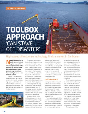 High-speed oil response technology finds a market in Caribbean ew developments in oil spill response technology have opened the way for response teams to deal more quickly and effectively with any given spill – and in particular to prevent the oil from reaching the shore – say European experts. The idea is to use conventional booms and skimmers in tandem with recently developed high-speed systems that can recover oil over a wider area, even in difficult conditions. This approach has been dubbed the ‘toolbox concept’.
