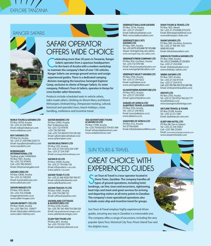 elebrating more than 30 years in Tanzania, Ranger Safaris operates from a spacious headquarters in the heart of Arusha with a modern workshop to maintain the company’s fleet of over 150 vehicles. Ranger Safaris can arrange ground sevices and assign experienced guides. There is a dedicated camping division managing the luxurious Serengeti Explorer Camp, exclusive to clients of Ranger Safaris. Its sister company, Pollman’s Tours & Safaris, operates in Kenya for cross border safari itineraries. Products include scheduled seats in vehicle safaris, tailor-made safaris, climbing on Mount Meru and Mount Kilimanjaro, birdwatching, chimpanzee tracking, cultural, historical and specialist tours, beach holidays, cruise handling, conference and incentive travel. ROIKA TOURS & SAFARIS LTD PO Box 14793, Arusha Tel: +255 22 250 9994 Email: roika@roikatours.com www.roikatours.com ROY SAFARIS LTD PO Box 50, Arusha Tel: +255 27 2507940/2502115 Email: roysafaris@intafrica.com www.roysafaris.com RUMANGABO INTERNATIONAL LTD Trading under: KANANGA PO Box 7401, Arusha Tel: +255 732 979478 Cell: +255 786 065651 Email: info@rumangabo.com SAFARI CARE LTD PO Box 13836, Arusha Tel: +255 22 2182292 Email: tour@safaricare.com www.safaricare.com SAFARI IMAGES LTD PO Box 1410, Moshi Tel: +255 754 276588 images@bennetts.co.tz www.safari-images.com SAFARI INFINITY (TZ) LTD PO Box 14345, Arusha Tel: +255 786/754 - 039077 Email: info@safari-infinity.com www.safari-inifinity.com