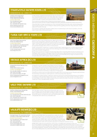 Wildlife Safari (K) Ltd MEMBERSHIP NO. 194 - JOINED 1983 Serengeti House, 101 James Gichuru Road Lavington, PO Box 56803-00200, Nairobi Contact: Tom Fernandes Tel: +254 (0)20 387 1703/73630/73977 Cell: +254 733 612594 Fax: +254 (0)20 387 1699 Email: info@wildlifesafari.co.ke www.africa-wildlife-safari.com