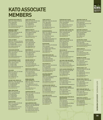 KMN 526/ 2011. PO Box 27429-00100, NBI Contact: Paul Simba Arati Tel: +254 (0)20 222 0556 Fax: +254 (0)20 222 5801 Email: info@aipasafaris.com www.aipasafaris.com KMN 488/ 2011 "PO Box 19055-00501, NBI Contact: Lydia Besseling Wanjiah Tel: +254 (0)20 318 233/34 Fax: +254 (0)20 318 235 Email: info@amicabretravel.com www.amicabretravel.com