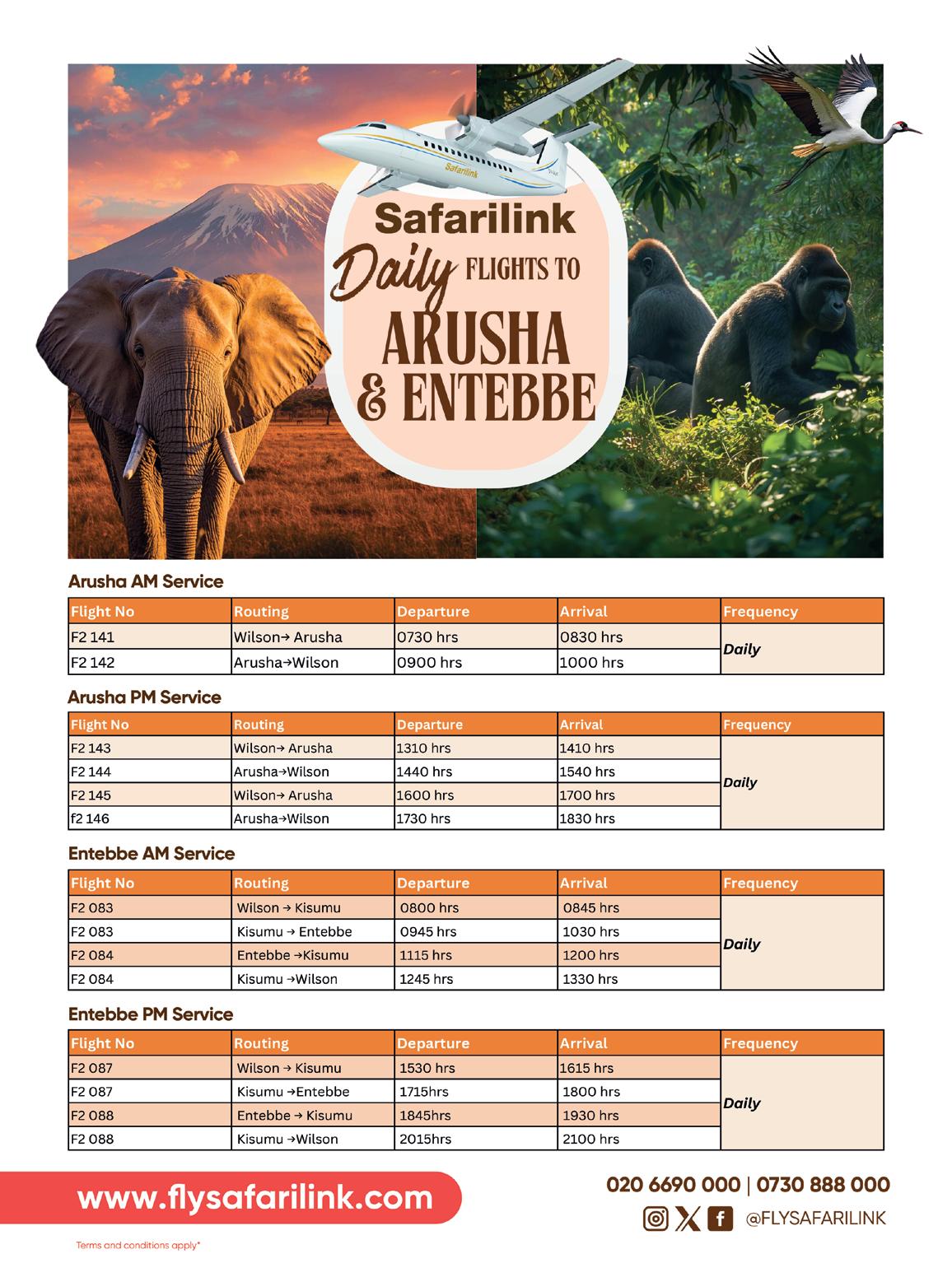 As well as our award-winning domestic services, we are also building an international network of destinations. In February we added daily afternoon flights to Entebbe to add to the morning flights that were launched to the Ugandan city in December 2025. The route, from Nairobi via Kisumu, unlocks gorilla trekking adventures in Bwindi Impenetrable Forest as well as regional trade opportunities. Safarilink passengers can also leave Kenya for the beautiful beaches of Zanzibar and the mountains and wildlife of Arusha and Kilimanjaro in Tanzania.