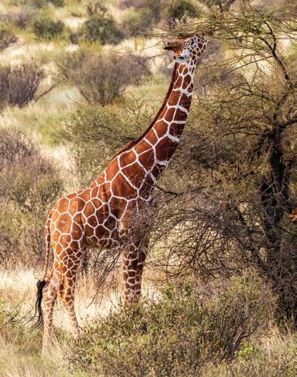 see, and suddenly there they are, like sentinels of the savannah: five reticulated giraffes, indolently munching on acacia trees. It is my first time seeing this rare species in the wild. They are stunningly beautiful, perhaps even more so than the far more populous Maasai giraffe. With slow, steady steps, I am able to get close enough to admire their coats—brown polygonal patches like the terracotta tiles of an Italian villa..