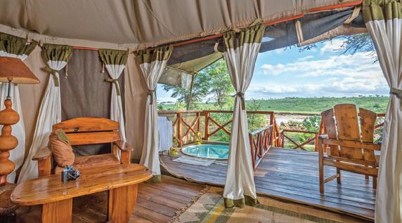 regular visitors to the site that staff know them individually, including one who prefers drinking from the tent’s private plunge pools rather than the Ewaso Nyiro – which is perhaps understandable given that its name translates from the Maasai language as ‘river of brown’ owing to its high volume of sediment. Apparently, the elephant is not put off quenching its thirst even if the plunge pool is occupied by a camp guest. The young morans (warriors) from the local Samburu community that act as the camp’s security team make guests aware when that particular elephant wanders into camp.