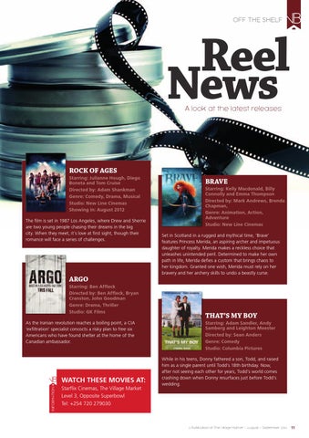 Starring: kelly Macdonald, Billy Connolly and Emma Thompson Directed by: Mark Andrews, Brenda Chapman, Genre: Animation, Action, Adventure Studio: New line Cinemas Set in Scotland in a rugged and mythical time, ‘Brave’ features Princess Merida, an aspiring archer and impetuous daughter of royalty. Merida makes a reckless choice that unleashes unintended peril. Determined to make her own path in life, Merida defi es a custom that brings chaos to her kingdom. Granted one wish, Merida must rely on her bravery and her archery skills to undo a beastly curse.