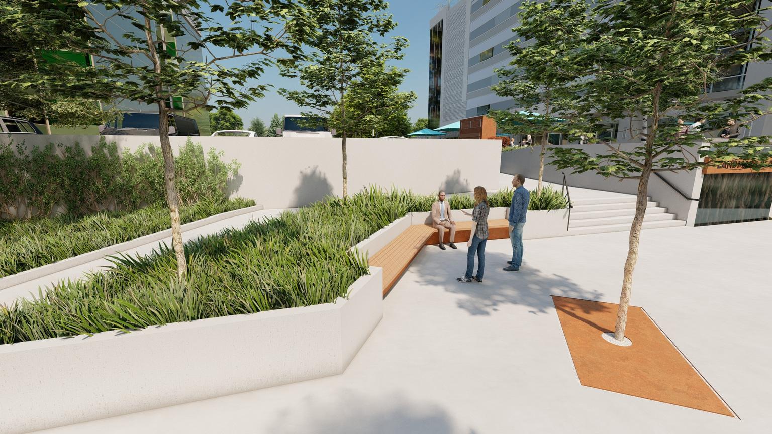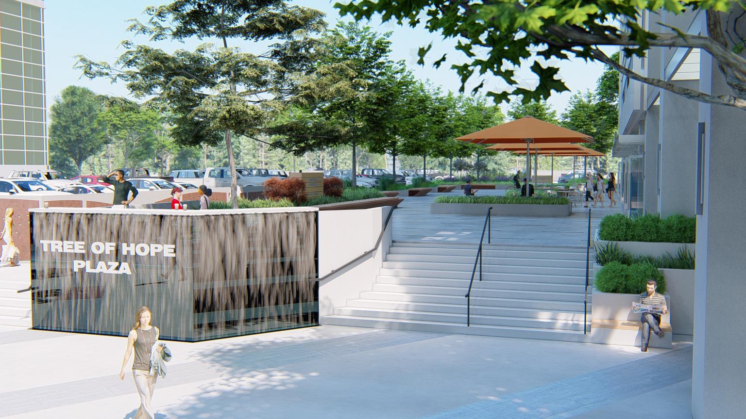 The plaza is conceived to be a permanent year round outdoor meeting space that serves to honour the Tree of Hope and its charitable works. It will serve as a public thoroughfare for pedestrians and cyclists to travel from the Landmark District over to the high speed transit along Harvey Ave and the pedestrian overpass leading to the Parkinson Recreation Centre. Starting at the south end will be a water feature and a grand staircase welcoming you up onto the accessible plaza with permanent seating and planting areas up top for all to enjoy We have developed a retail connection as the base of the LM7 building that serves to tie into the retail businesses located in the District Market and over to Landmark 3. (No more having to walk through the parking lot!) The completion of the plaza will be one more step in the creation of the Landmark District neighbourhood