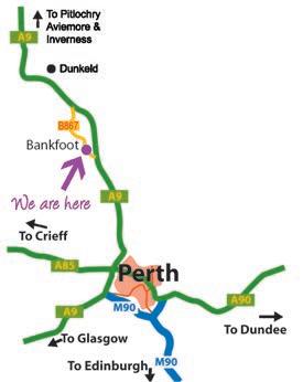 Estamos a solo 5 minutos en coche al norte de Perth y 20 minutos al sur de Pitlochry (Carretera A9, salida de Bankfoot). Siga las señales color marrón de Taste Perthshire.