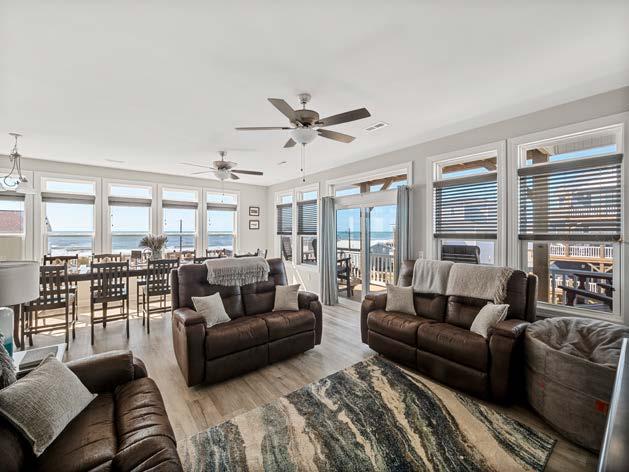 Stay in the heart of Surf City at this oceanfront duplex with unobstructed ocean views from nearly every room. With 5 bedrooms, 4 bathrooms, and space to comfortably sleep 12, this dog friendly retreat is perfect for family vacations, reunions, and beach getaways. A max of two dogs are allowed for an additional fee. The living room features a wall of windows overlooking the Atlantic with plenty of comfortable seating—it’s the perfect place to watch movies, host a game night, or simply relax while taking in the ocean views.