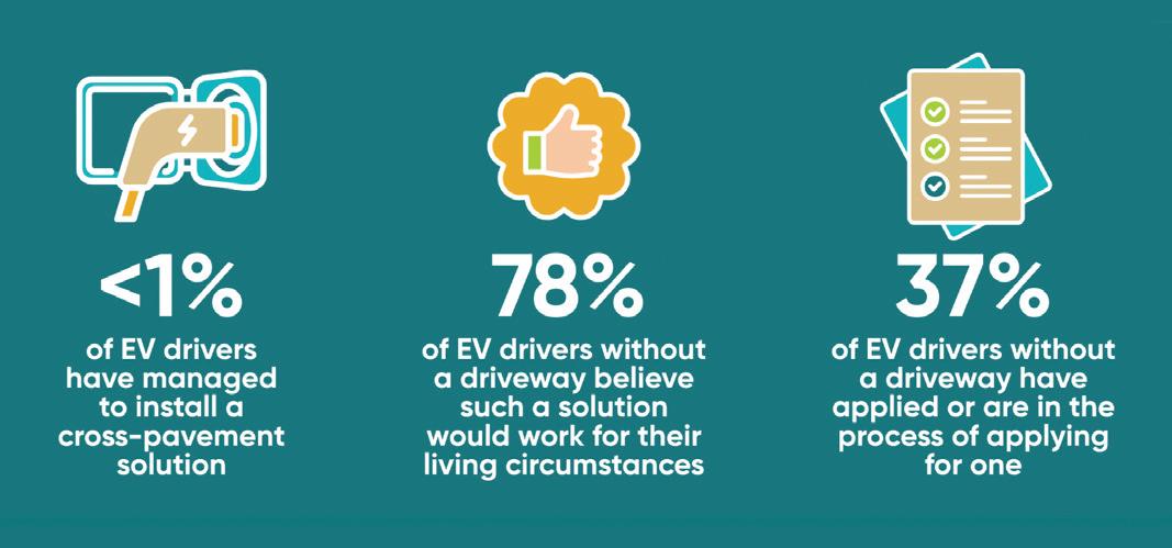 costs. One respondent said: “A cable gully would be ideal. I have solar and off-peak electricity. It’s cheaper for me, better for the grid, and avoids cluttering the street with chargers.”