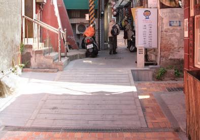 通道系統斷面由通道面、緣石、銜接面三者構成。中央通道面,按路段車行 人行需求,配置瀝青混凝土(米街區段)、石板(抽籤巷區段)、陶磚(巷弄空 間)等材料。兩側線性緣石,收整不明確輪廓,引導視線遊歷順行。 除通道面材之外,連接兩側建物的銜接面更是關鍵,除以階梯搭配小斜坡及 抿石子修飾外,垂直向的水電管線整合與落水管轉接入地下等,期待能更整 體、細緻地潤飾公私介面,以呈現歷史場域溫潤古樸的氛圍、優化傳統街區 品質和美學。