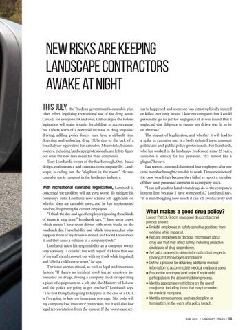 nario happened and someone was catastrophically injured or killed, not only would I lose my company, but I could personally go to jail for negligence if it was found that I neglected due diligence to ensure my driver was fit to be on the road.” The impact of legalization, and whether it will lead to a spike in cannabis use, is a hotly debated topic amongst politicians and public policy professionals. For Lombardi, who has worked in the landscape profession some 25 years, cannabis is already far too prevalent. “It’s almost like a plague,” he says. Last season, Lombardi dismissed four employees after one crew member brought cannabis to work. Three members of the crew were let go because they failed to report a member of their team possessed cannabis in a company truck. “I can tell you first hand what drugs do to the company’s bottom line, because I have witnessed it,” Lombardi says. “It is mindboggling how much it can kill productivity and