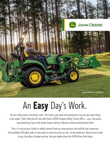 An Easy Day’s Work. No one really wants a hard day’s work. The truth is you want to be productive, but you also want things to be simple. That’s what the all-new John Deere 2025R Compact Utility Tractor offers – easy. Like quick, easy attaching of your mid-mount mower with our industry-exclusive AutoConnect Deck. Plus, it’s easy on you, thanks to added comfort from our new premium seat and full seat suspension. And available LED lights make it even easier to work once the sun sets. So be productive. But be sure to take it easy. Easy like a Sunday morning. Ask your dealer about the 2025R from John Deere.