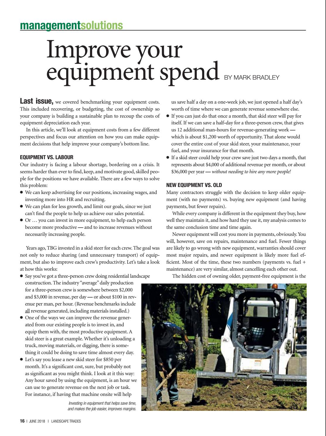 EQUIPMENT VS. LABOUR Our industry is facing a labour shortage, bordering on a crisis. It seems harder than ever to find, keep, and motivate good, skilled people for the positions we have available. There are a few ways to solve this problem: l We can keep advertising for our positions, increasing wages, and investing more into HR and recruiting. l We can plan for less growth, and limit our goals, since we just can’t find the people to help us achieve our sales potential. l Or … you can invest in more equipment, to help each person become more productive — and to increase revenues without necessarily increasing people. Years ago, TBG invested in a skid steer for each crew. The goal was not only to reduce sharing (and unnecessary transport) of equipment, but also to improve each crew’s productivity. Let’s take a look at how this works: l Say you’ve got a three-person crew doing residential landscape construction. The industry “average” daily production for a three-person crew is somewhere between $2,000 and $3,000 in revenue, per day — or about $100 in revenue per man, per hour. (Revenue benchmarks include all revenue generated, including materials installed.) l One of the ways we can improve the revenue generated from our existing people is to invest in, and equip them with, the most productive equipment. A skid steer is a great example. Whether it’s unloading a truck, moving materials, or digging, there is something it could be doing to save time almost every day. l Let’s say you lease a new skid steer for $850 per month. It’s a significant cost, sure, but probably not as significant as you might think. I look at it this way: Any hour saved by using the equipment, is an hour we can use to generate revenue on the next job or task. For instance, if having that machine onsite will help Investing in equipment that helps save time, and makes the job easier, improves margins.