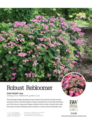 Robust Rebloomer TUFF STUFF® Red Hydrangea serrata ‘SMNMAKTSR’ pp#28672, cbraf This hydrangea begins blooming in early summer and continues through autumn, ensuring a showy, abundant display of large, lacecap flowers. Deep pink-red blooms, set off by lustrous, deep green foliage combined with its small, rounded habit make this hardy mountain hydrangea extra versatile in a wide variety of landscape uses.